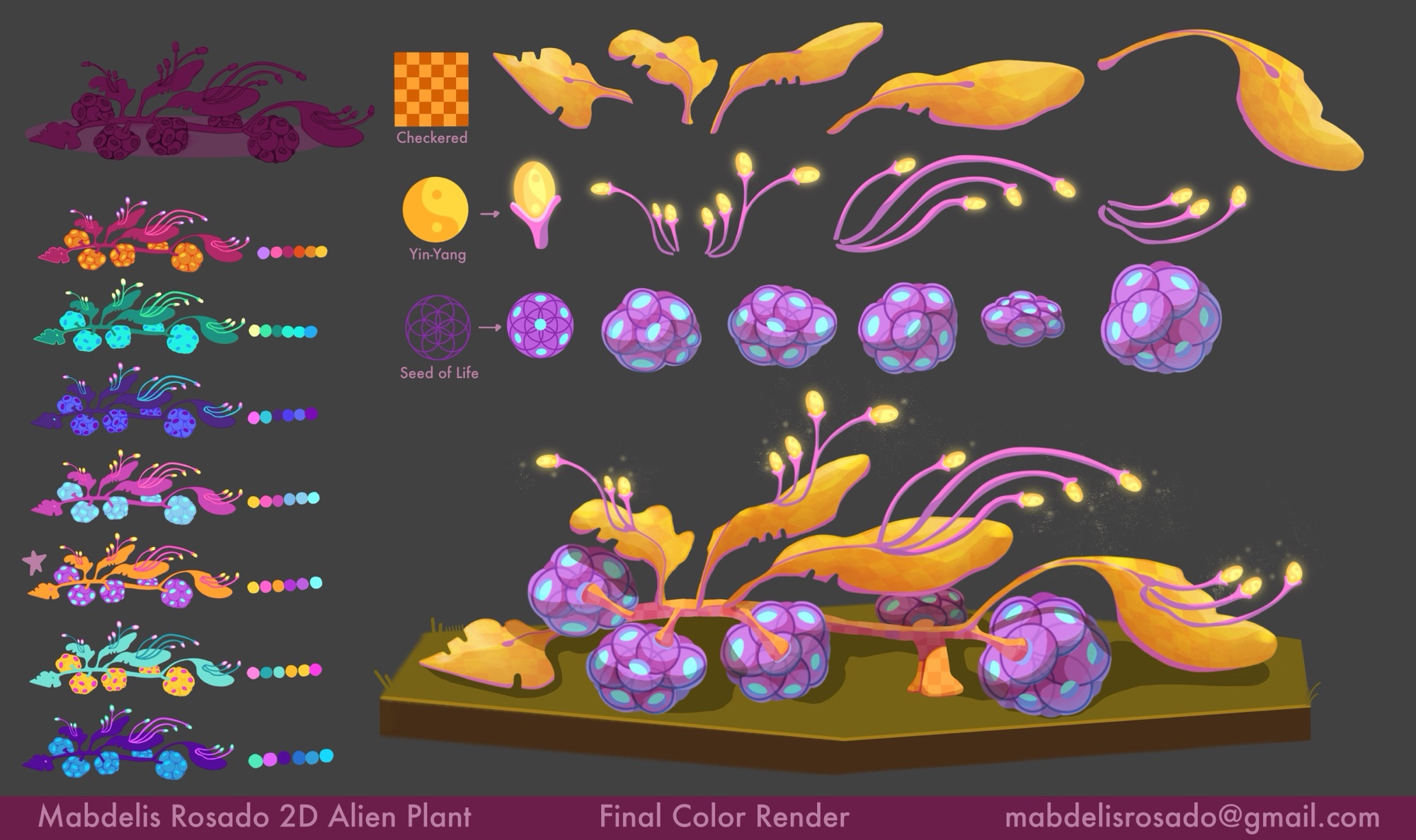 Prompt: Design a plant from an alien world, incorporating sacred geometry and/or geometric patterns. 2D asset for a Studio Ghibli-adjacent style, 2.5D game.